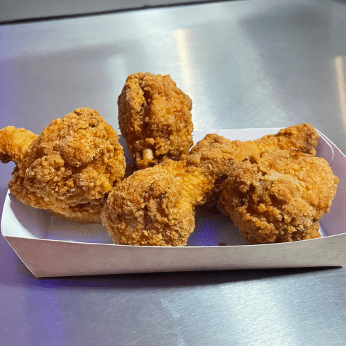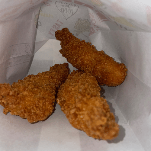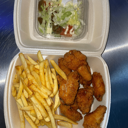 3 hot wings, 3 chicken bites, 3 kipstrips en een portie friet